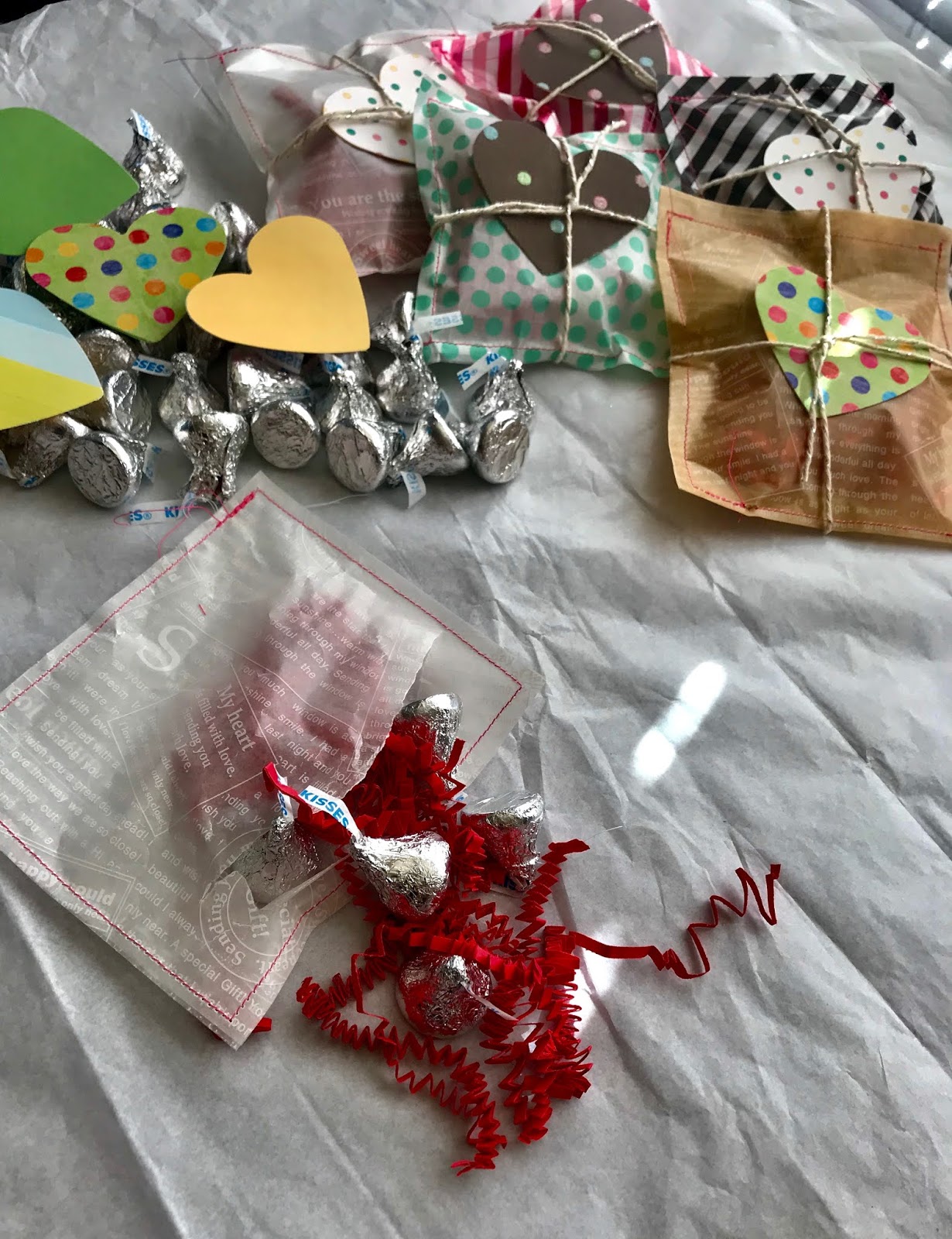 Each hand-sewn parchment paper valentine is filled with 5 Hershey’s Kisses nestled in red crinkled paper, and bound with twine or ribbon. A double-sided heart card is included for your small, sweet message.